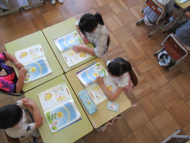 国語の時間、4人グループで人間の心の葛藤を話し合っていました。