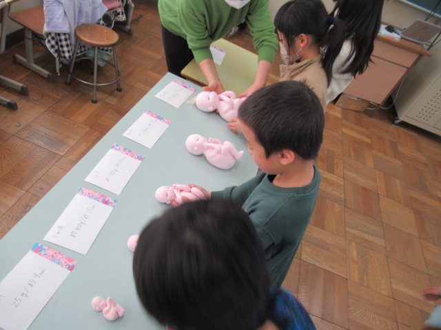 子どもたちは、赤ちゃん(人形)の成長や重さを実感していました。