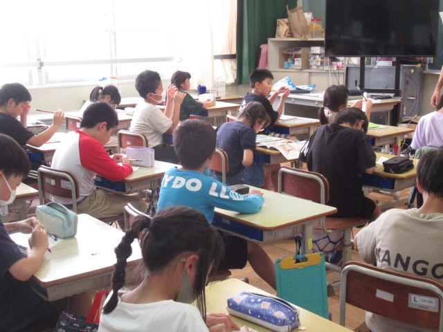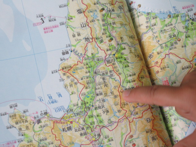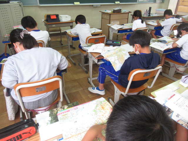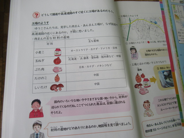 明日のデイキャンプの確認をしています。社会の学習では、肉まんの原料の玉ねぎが北海道で作られたものであることを地図で確かめています。