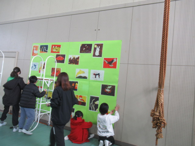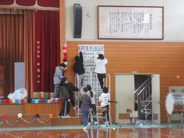 6年生送る会に向け、準備が進んでいます。各学年では、出し物の練習をしています。5年生が中心になって体育館の飾り付けをしています。先生や支援員さんたちも一緒にやっています。