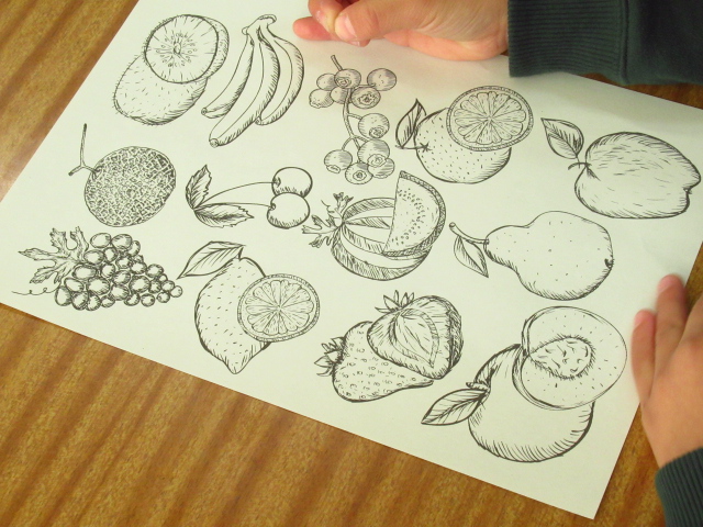 英語の時間はフルーツに色を塗っています。もちろん英語での指示です。