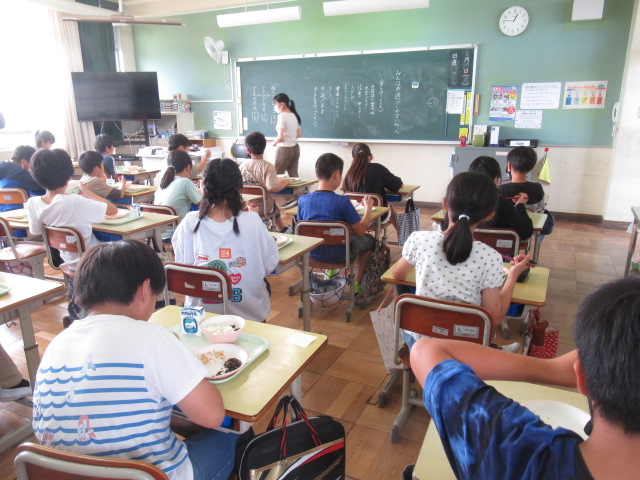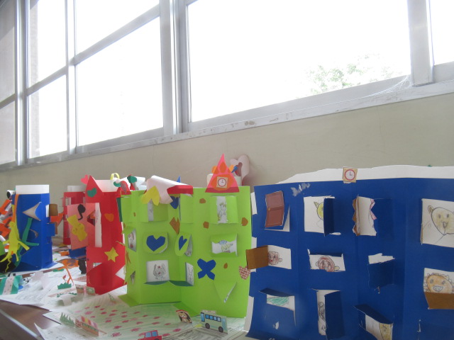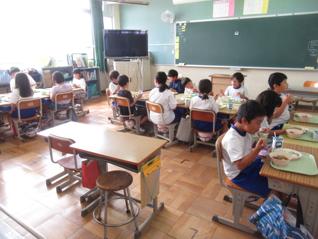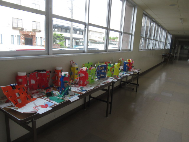 給食の時間の様子です。また図工で作った作品が並べられています。