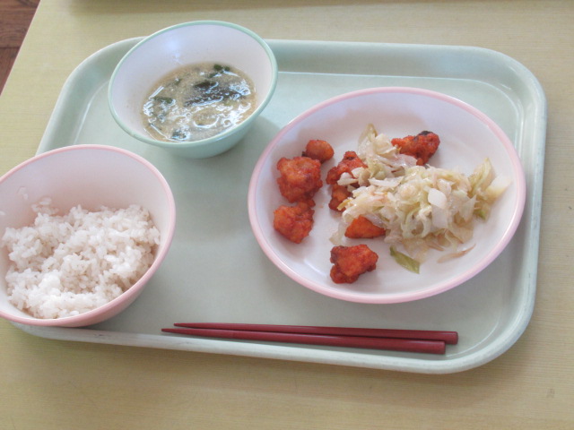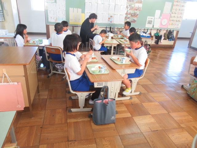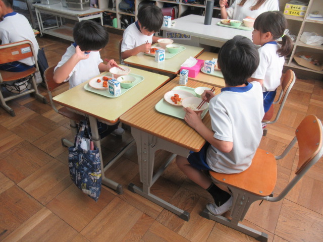 給食の時間の様子です。先生や友達と楽しく食べています。