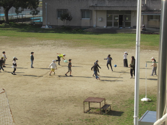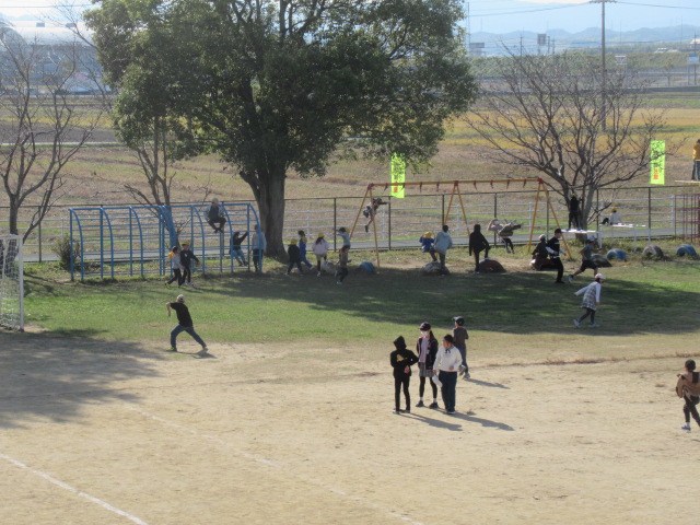 よく遊び、よく学べ。寒くても走りまわっています。先生も一緒に遊んでいます。