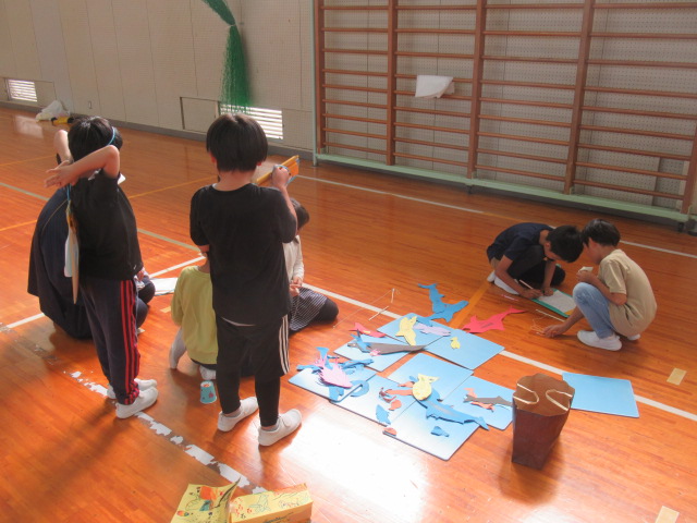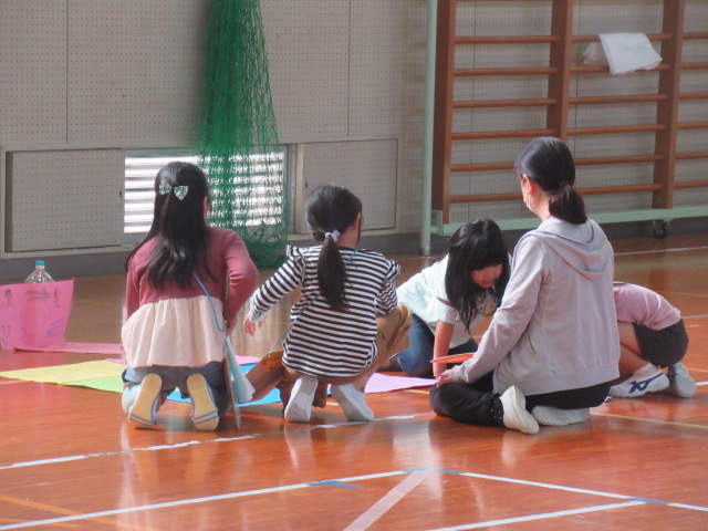 2年生が作った手作りのゲーム遊びに1年生を招待し、一緒に遊びました。