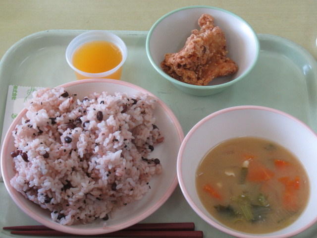 いよいよ最後の給食です。今日のこんだては、みそ汁、赤飯、唐揚げ、みかんゼリー。人気のメニューです。こどもたちもおかわりをしていました。
