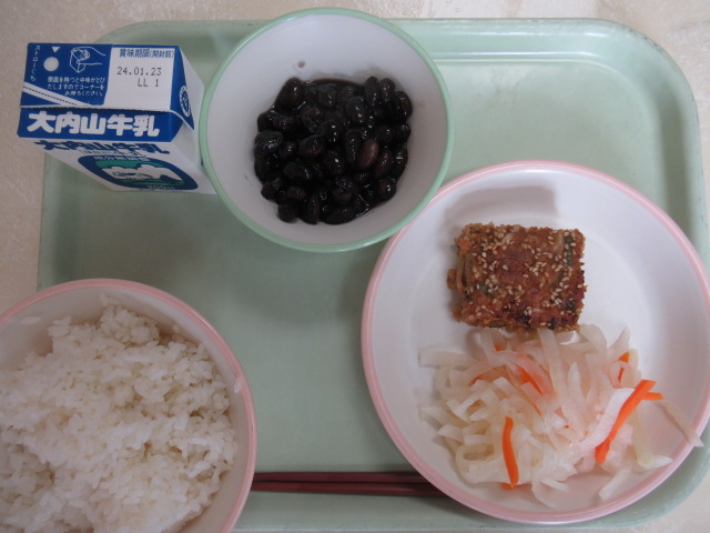 昨日は黒豆、松風焼き、紅白なます、今日はたたきごぼうがでました。(昨日の給食)