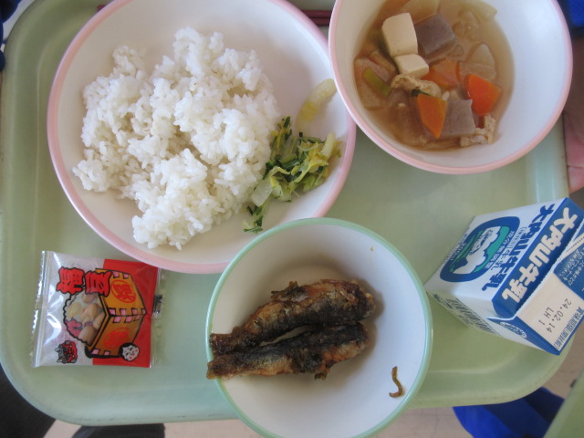 今日の給食は、節分にちなんで、いわしとまめがでました。