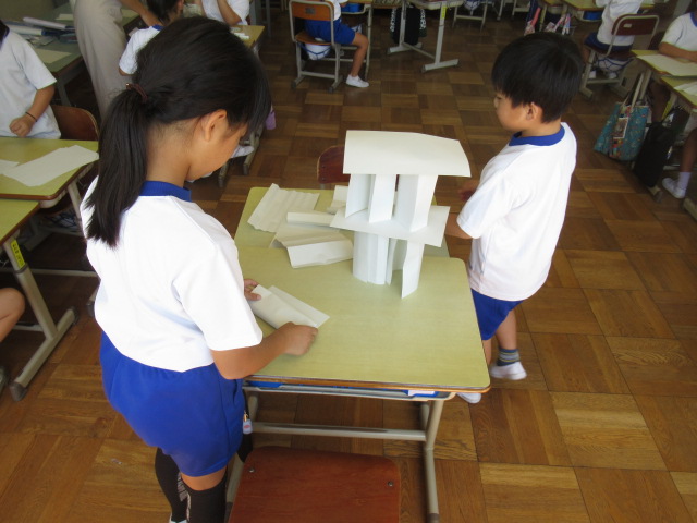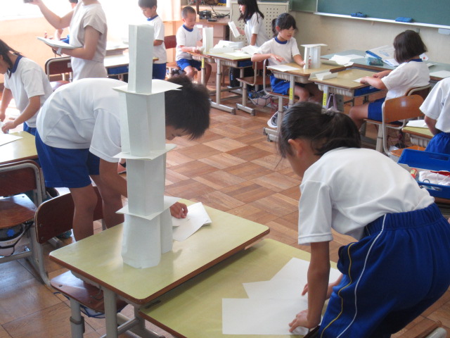 紙タワーをグループで作っています。どれだけ高くたてることができるでしょうか。