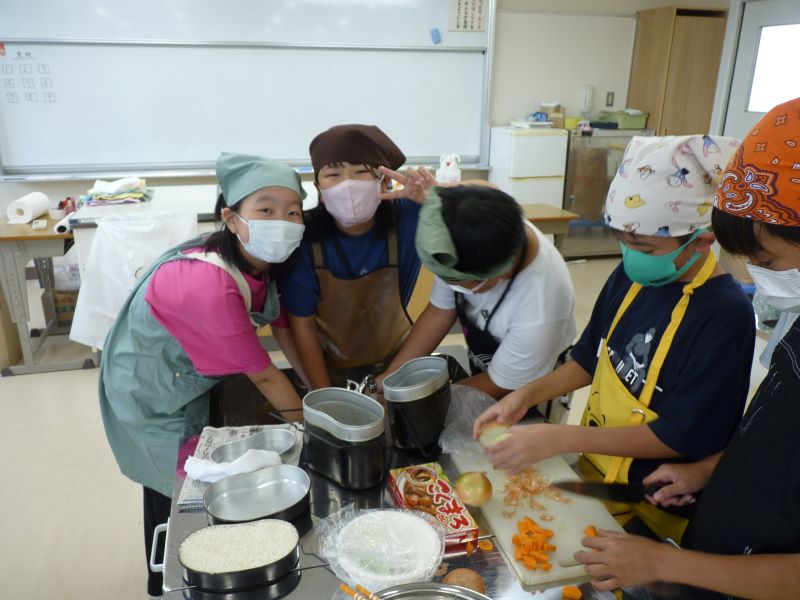 9月26日(金)のデイキャンプに向けて、5年生が調理実習をしました。飯盒でご飯を炊いたり、お味噌汁を作ったりしました。