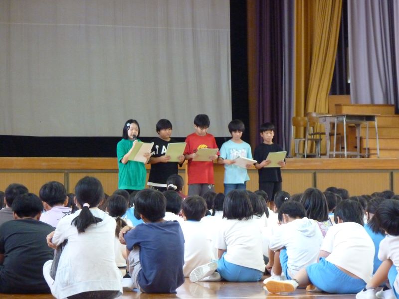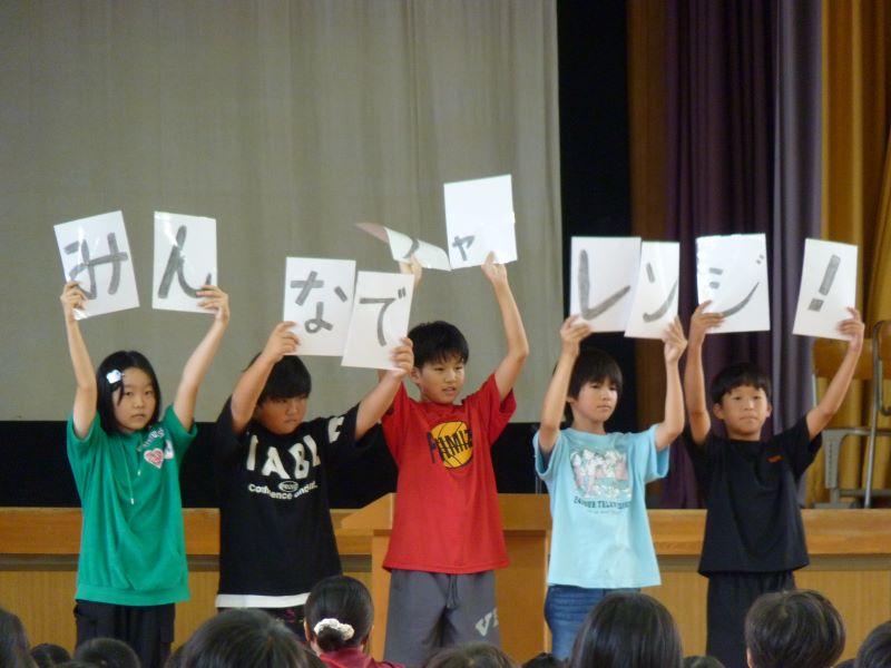 9月29日(月)、児童集会がありました。後期の児童会の新役員が児童の前に立ちスローガンを伝えました。よろしくお願いします。
