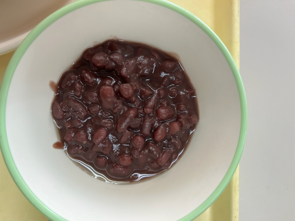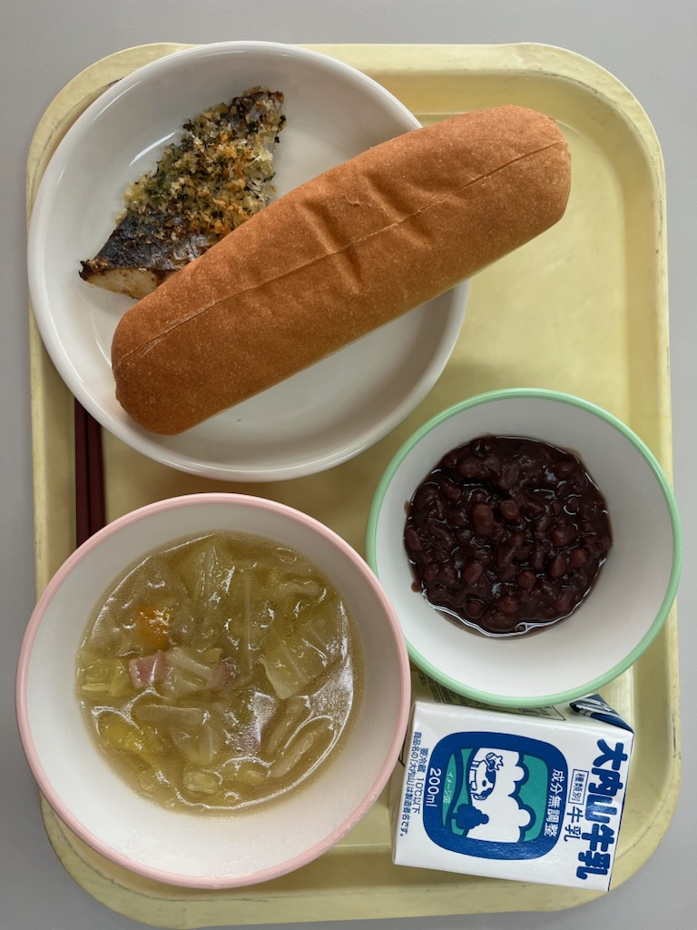 「セルフあんパン」です!今日の「あんこ」は給食室で小豆から煮込んで作ってくれました。背に切り込みが入っているコッペパンに自分であんこを挟んで「いただきます!」。