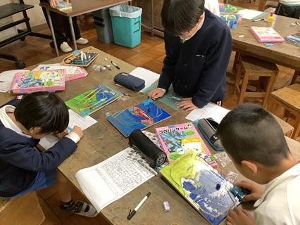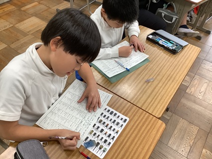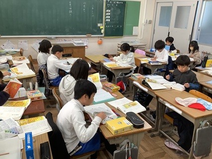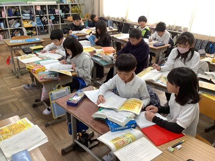 11月21日(金)3年生が国語「三年とうげ」という物語文の意味調べをしていました。国語辞典の使い方を1学期に習って、辞書の使い方にもずいぶん慣れてきた子、まだもう少し時間のかかる子とさまざまですが、どの子も一生懸命意味調べに取り組んでいました。繰り返し辞書引きをすることでだんだん速くなっていくと思います。また、この「三年とうげ」のお話では、「かえで」「がまずみ」「ぬるで」「すすき」「ふでりんどう」と秋の植物がたくさん出てきます。辞書には、写真も載っていたり、タブレット等で調べると写真が見られたりしますが、ぜひとも本物を見られる機会があればいいなと思いました。