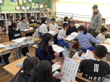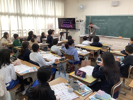 11月21日(金)5年生が英語の時間、レストランでお店の人が注文をきいたり、お客さんが注文したりするやりとりを学習していました。今日は、ALTのジョーダン先生も担任の先生と一緒に、食べ物、飲み物の単語や注文の聞き方、答え方を繰り返し教えてくれました。子どもたちは、何度も何度も声に出して練習し、その後、ペアでお店の人、お客さん役になっていました。「What would you like?」「I’d like ・・・.」と上手に楽しそうにやりとりしていました。