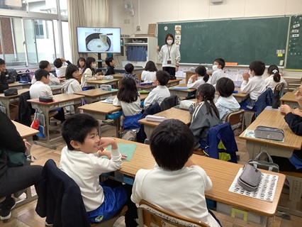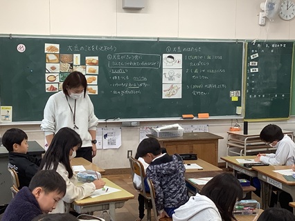 11月25日(火)3年生が食育で栄養教諭の先生に「大豆のことをもっと知ろう」の授業をしていただきました。3年生は、国語「すがたをかえる大豆」の説明文を学習したので、大豆がいろいろな食品になっていることを知っています。給食の献立の中で、大豆食品を探してみると、こんなに大豆食品が使われているのだと驚いたようでした。また、大豆のはたらきを教えてもらい、もっと大豆食品を食べようという思いになった子がたくさんいたようです。今日の給食は、「きのこの豆乳チャウダー」です。きっとおいしく、栄養を感じながら食べてくれる3年生でしょう。