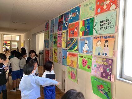 11月26日(水)4年生が人権ポスターを鑑賞しました。人権ポスターは、5,6年生が描いたものです。どのポスターもしっかりとした思い、メッセージが込められています。4年生は、自分たちがこれまで学習してきたことをふり返りながら鑑賞している子もいました。これも人権学習をしてきた成果だと思います。