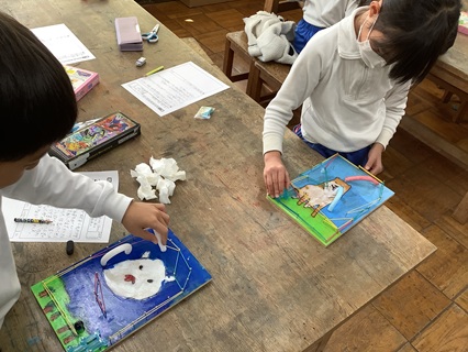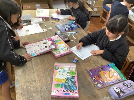 11月28日(金)3年生が図工でコロリンゲームの鑑賞をしていました。2週間前、一生懸命、金槌でくぎ打ちして作っていたコロリンゲームが完成したのです。楽しいしかけが作ってあったり、板に個性あふれる絵が描かれていたりして、すてきな作品が出来上がっていました。子どもたちは、楽しく遊びながら自分や友だちの作品のよさをみつけていました。