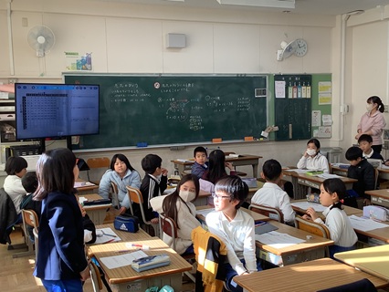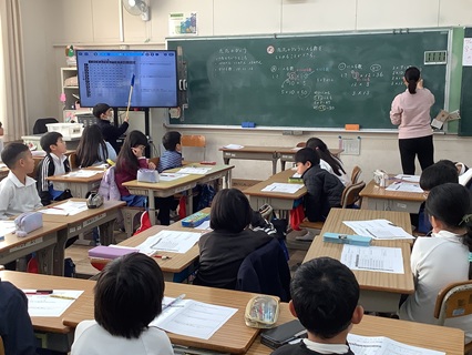 「3×12」の答えの求め方をペアで話し合い、みんなの前で発表していました。3の段の九九は、答えが3ずつ大きくなるということを使って説明していました。前に出て指示棒を使って説明するのも慣れたもので上手です。発表しているのを聞くようすもすてきです。