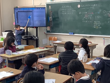 11月28日(金)2年生は、2学期から九九の学習が始まりました。すべての九九の学習が終わり、その九九を使って、九九の表に入る数をもとめる学習をしていました。