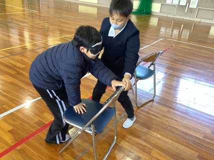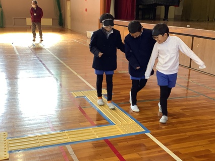 1月23日(金)4年生が社会福祉協議会の方に来ていただき、アイマスク・バリアントール体験をさせていただきました。視覚障害について知り、介助の仕方を学びました。アイマスクをつけて歩くとき、近くに友だちがいて、言葉で誘導してくれても、「見えないのは、こわい。」「方向がわからなくなる。」と子どもたちは、率直な感想を言っていました。だからこそ、言葉で丁寧に伝えることが大切なことも実感したようです。点字ブロックの上を歩いたり、コーンで狭い道を設定して歩いたり、いすに座ったり、いろいろな体験をしました。また、バリアントール体験もし、いろいろな見え方をする方がいることも知りました。バリアントールとは、色弱者の色の見分けにくさを体験できる眼鏡です。これらの体験を通して、知ったこと、感じたことがたくさんあったと思います。心のバリアフリーという言葉がありますが、相手の立場に立って考え、必要な配慮や行動ができることが大切だと思います。