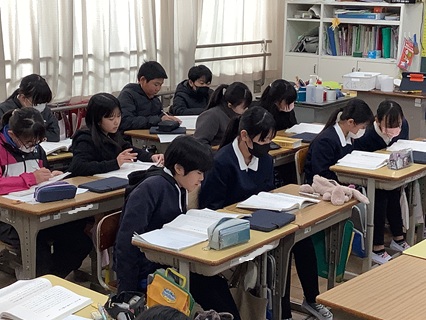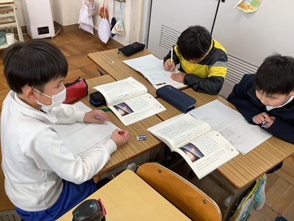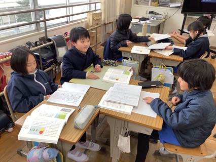 1月26日(月)4年生が国語「風船で宇宙へ」の学習をグループで進めていました。グループで音読をし、それぞれがノートに感想を書き、その感想をグループでノートを交換して読み合い、感想を伝えていました。グループで学習することにより、より一人ひとりが考え発言したり、わからないことを聞き合ったり、ノートのまとめ方の工夫を知ったり、深くなります。どの子も友だちと関わりながら、一生懸命、学びを進めていました。グループでの学びは、学級全体へも活かしていきます。