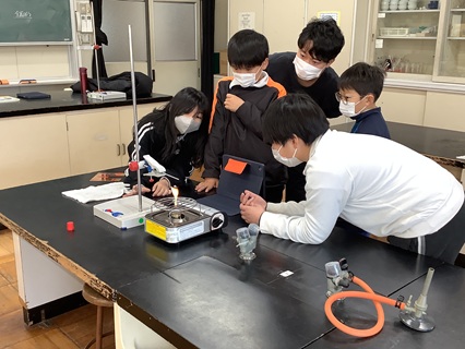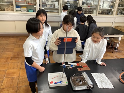 1月27日(火)4年生が理科「もののあたたまり方」の学習で、実験をしていました。金属の棒や板を温めると、どのように熱が伝わっていくかをはじめに予想を立て、実験をしました。子どもたちは、温めたところから熱が伝わっていくだろうと予想していました。金属の棒や板に示温テープを貼り、熱の伝わり方を見ます。温度が上がると、テープの色が変わるので、色の変化で熱の伝わり方がよくわかります。子どもたちは、示温テープの色が変わると、「変わった!」「やっぱり、予想どおりや。」と歓声を静かに上げていました。予想を立て、実験し確かめるという理科のおもしろさを実感している様子でした。