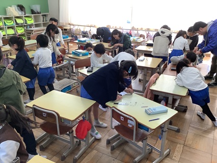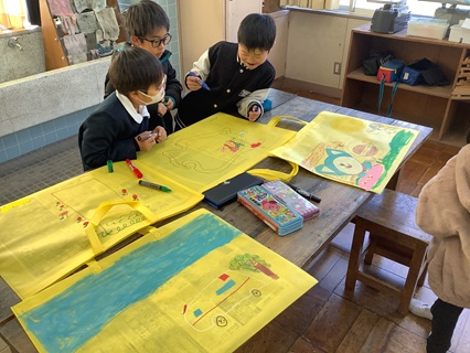 3月12日(木)1年生が図工で作品バックを作っていました。この一年図工で作ったり、描いたりした作品を入れるバッグです。カラーマジックで、子どもたちは自分が描きたい絵を思い思いに描いていました。「見てー。」と自分が描いた絵を見せてくれる表情がとてもにこにこで楽しそうでした。きっとすてきな作品バッグができあがることでしょう。おうちに持ち帰ったら、作品を見ながら、親子で一年の思い出をふり返り、成長を感じ合ってほしいと思います。