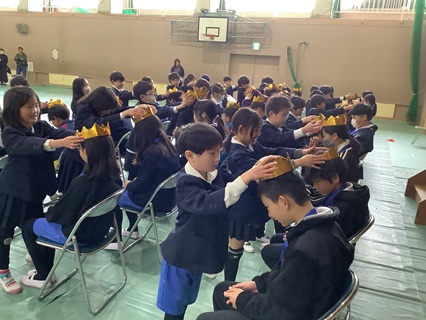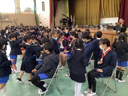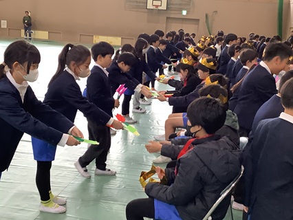 3月18日(水)おわかれ式を行いました。明日の卒業式には、在校生は4,5年生が出席します。そのため、1,2,3年生は、おわかれ式を行いました。卒業式と同じように、6年生が入場し、1,2,3年生が在校生の席に座り、拍手で迎えました。1,2,3年生が、これまで6年生にしてもらったこと、すてきな姿について、大きな声で呼びかけをしました。6年生と一緒に心をこめて校歌も歌いました。とてもすてきな歌声に感動しました。そして、1年生からはメダル、2年生からは王冠、3年生からは折り紙の花束を6年生にプレゼントしました。一志西小学校をリードしてくれていた6年生が、とてもみんな大好きだったこと、そして、感謝していることが伝わるおわかれ式でした。