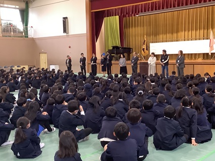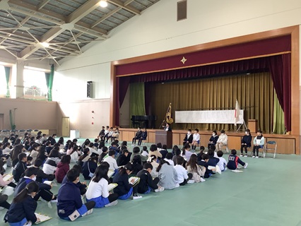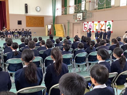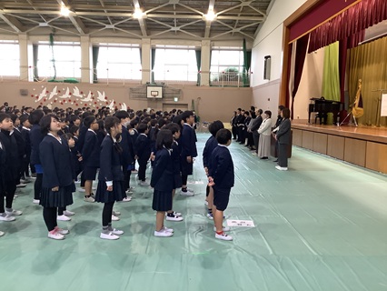 続いて、年度末人事により、一志西小を去る先生方を紹介し、離任式を行いました。お別れは、とてもさみしいです。子どもたちも先生方からのお話をしっかり聞き、別れを惜しんでいました。最後に、みんなで校歌を歌い、お別れする先生方へのプレゼントとしました。体育館に響く子どもたちの歌声は、最高のプレゼントとなりました。