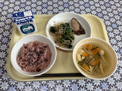 3月18日(水)今年度最後の給食でした。メニューは、赤飯、ぶりの照り焼き、ほうれん草のおかかあえ、すましじる、牛乳でした。お祝いメニューです。この1年栄養バランスを考え、おいしい給食を提供してくださった給食センターの方に感謝です。