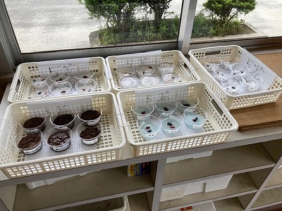 水、空気、肥料、土などの有無が発芽の様子にどのように関わっているか、それぞれのカップにタネをいれて対比実験をしているのでした。