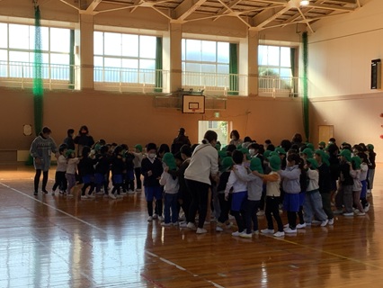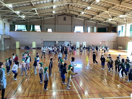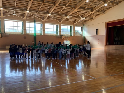 2月17日(火)1年生が一志こども園の年長さんと交流会をもち、楽しい時間を過ごしました。まず、じゃんけん列車をしました。音楽に合わせて、体育館中を歩き、出会った子とじゃんけんをします。負けたら、勝った子の列の後ろについていきます。最後は、長い長い列になりました。こども園の子がチャンピオンになり、みんなで拍手をしました。こども園の子も1年生のみんなも心がほぐれ、笑顔があふれる交流会のスタートとなりました。じゃんけん列車の後は、ドッジボールを楽しみました。