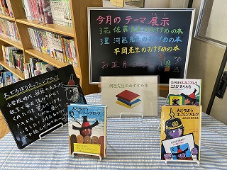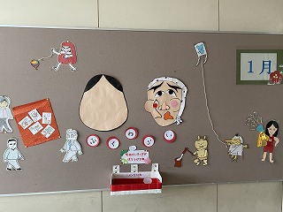 そして、1月らしい図書室前の掲示板です。図書ボランティアの皆さん、早速ありがとうございます。
