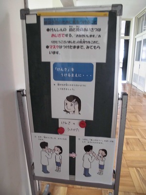 たくさん続いてきた検診の最後、眼科検診でした。1・3・5年生が診ていただきました。検診を待つ廊下には、診てもらい方が掲示されていました。子どもたちは要領を得て、完璧な受診態度でした! 1年生の様子です。ソーシャルディスタンス、静寂、お医者さんへの礼儀、どれをとっても素晴らしかったです! お世話になったお医者様、奮闘した養護教諭、しっかりと受けることのできた子どもたち、担任の先生方、かかわってくださった全ての皆さんに感謝です。これからも子どもたちの健康と安全を見守っていきます! |