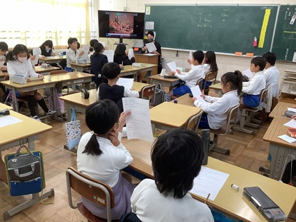 10月29日(水)4年生が人権集会で歌う歌を初めて聞いて歌い始めていました。4年生がこれまで学習してきたことが歌詞のあちこちに当てはまります。私は、初めて聞いた曲でしたが、とてもすてきな歌だなぁと感動しました。子どもたちは、音源が鳴ると自然に手拍子もして、きれいな声で歌っていました。きっとこれから練習を重ね、本番ですてきな4年生の声が響き渡ると思います。楽しみです。