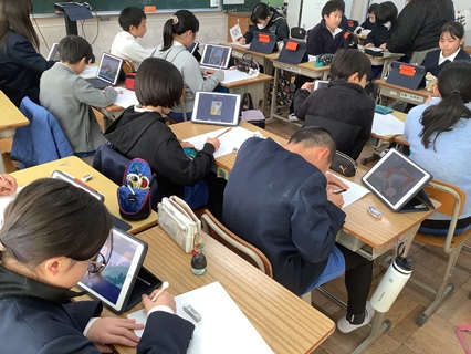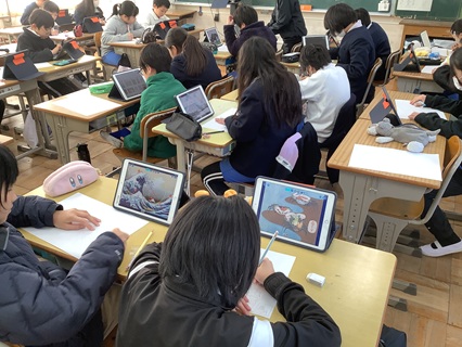 1月14日(木)5年生が木版画の下絵を描いていました。テーマは、「昔の日本の絵」ということで、浮世絵などを調べて模写していました。「むずかしい!」という声も漏れ出ていましたが、タブレット端末を見て、集中して描いていました。木版画で多色刷りをするとのことです。完成が楽しみです。