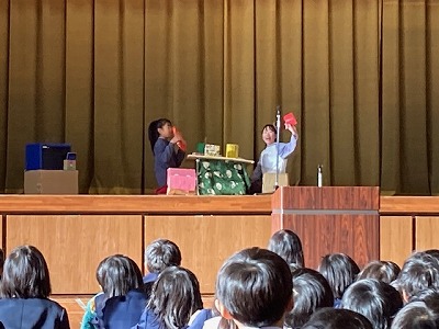 体育館で終業式を行いました。その中で、児童会役員のみなさんが劇をしながら、冬休みの生活について注意してほしいことを2つ伝えてくれました。