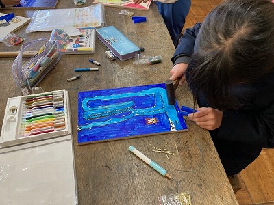中をのぞくと3年生がパチンコのような作品を作っているところでした。