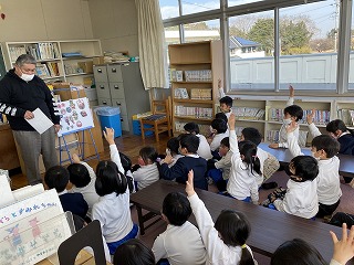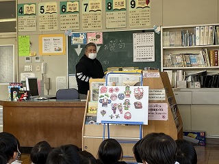 古川先生によるおはなし会を聴いていた1年生。こちらは1星です。お正月にまつわる文化や行事などについて話をしてくださいました。門松やしめ縄、宝船など、どんな意味があるのかな? おせち料理ってどんなものが入っているのかな? みんなそれぞれの家ではどんな料理を入れるのか、話してくれました。黒豆やエビを入れることの意味など、みんなよく知っていますね! 文化が受け継がれていくのを感じて嬉しかったです。