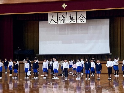 体育館で2年生が人権集会の練習をしていました。