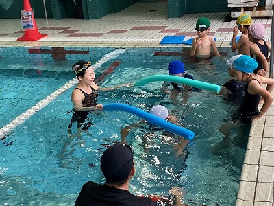 このグループは、水面近くのスポンジのような素材の棒をくぐることで、水中に顔をつけることに段々慣れていきました。
