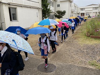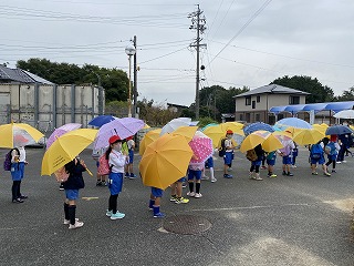 早朝よりのマチコミで遠足実施のお知らせを流し、8時20分に各教室で遠足の準備を確認して外へ出ました!このころから雨がぱらつき始めましたが、傘とカッパで対応していざ遠足へ! 1~4年生までが出かけました。