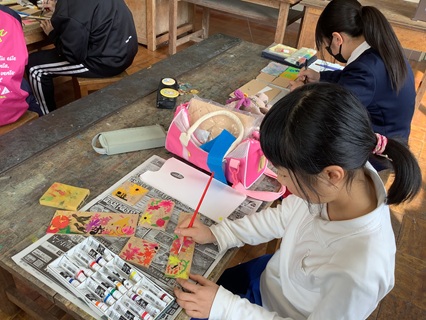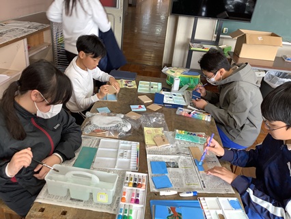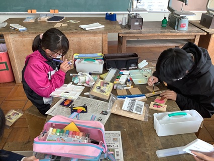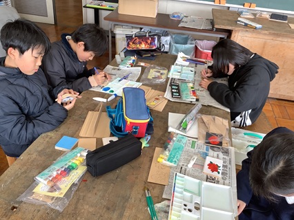 2月16日(月)6年生が図工でタブレットラックを作成していました。今日は、それぞれが思い思いのイラストを板に描いているところでした。動物や花などのイラストを丁寧に描き、着色をしていました。板を組み立ててみて、全体像を見ている子もいました。完成が楽しみです。
