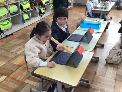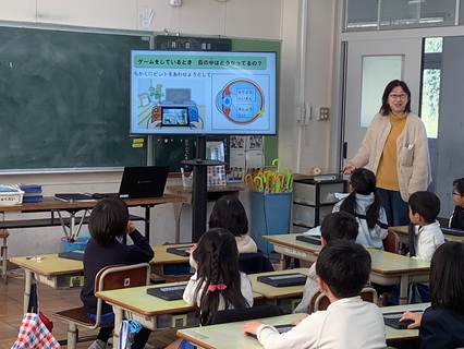 1月13日(火)1年生が身体測定の前に、養護教諭から目を大切にするための話を聞き学習しました。学校でもタブレット端末を使って学習することが多くなっていますが、おうちでもゲームをしたり、動画を見たりと、メディアを使用する機会が多いと思います。メディアを20分使ったら、20秒目を休めるということも話に出ていましたが、長時間使用することで、目が大変疲れることなどを知ることができました。また、メディアを使うときの姿勢についても、だいたい30cmくらいははなす、両手をパーに開いて引っ付けたくらいと教えてもらい試していました。便利で楽しいものでも、ほどほどにが大切ですね。今日学習したことをぜひ実践してほしいです。