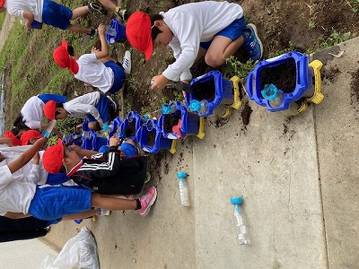 2年生が植木鉢に土を入れていました。