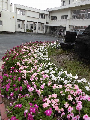 東門ロータリーで子どもたちを出迎えてくれる色とりどりの日々草!心が明るくなりますね! 世話をしてくれている先生や子どもたちに感謝!