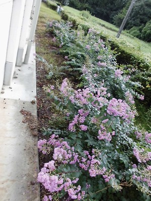 校舎北側。先日、ぼうぼうの草を刈ったので、すっきりしています。知らぬ間に生えていたサルスベリ。