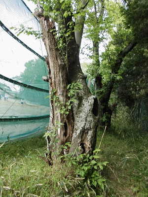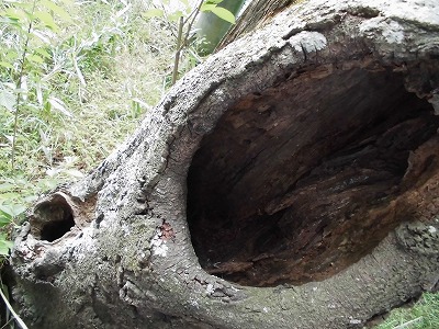 バス駐車場の近く、子どもたちの最近のブームである たけのこスポット のところにすごい桜の木があります。幹にあいたいくつもの “うろ” がわかっていただけるでしょうか?