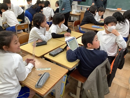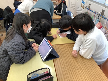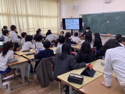 2月5日(木)4年生がグループ対抗戦で漢字ゲームを楽しんでいました。「木」へんの漢字を制限時間内にどれだけ多く集められるかを競争です。友だちと思いついた「木」へんの漢字をタブレット端末に記録していきます。教室内の掲示物などに「木」へんの漢字はないか見渡してみたり、友だちの名前の中に「木」へんの漢字がないか考えたり、必死に探していました。どのグループがいくつみつけたか、先生がテレビ画面で採点してくれるのを注視する姿に、「勝つぞ!」の気迫を感じました。