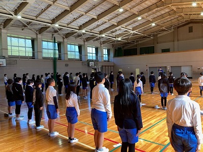 4年生が体育館で人権集会の練習をしていました。